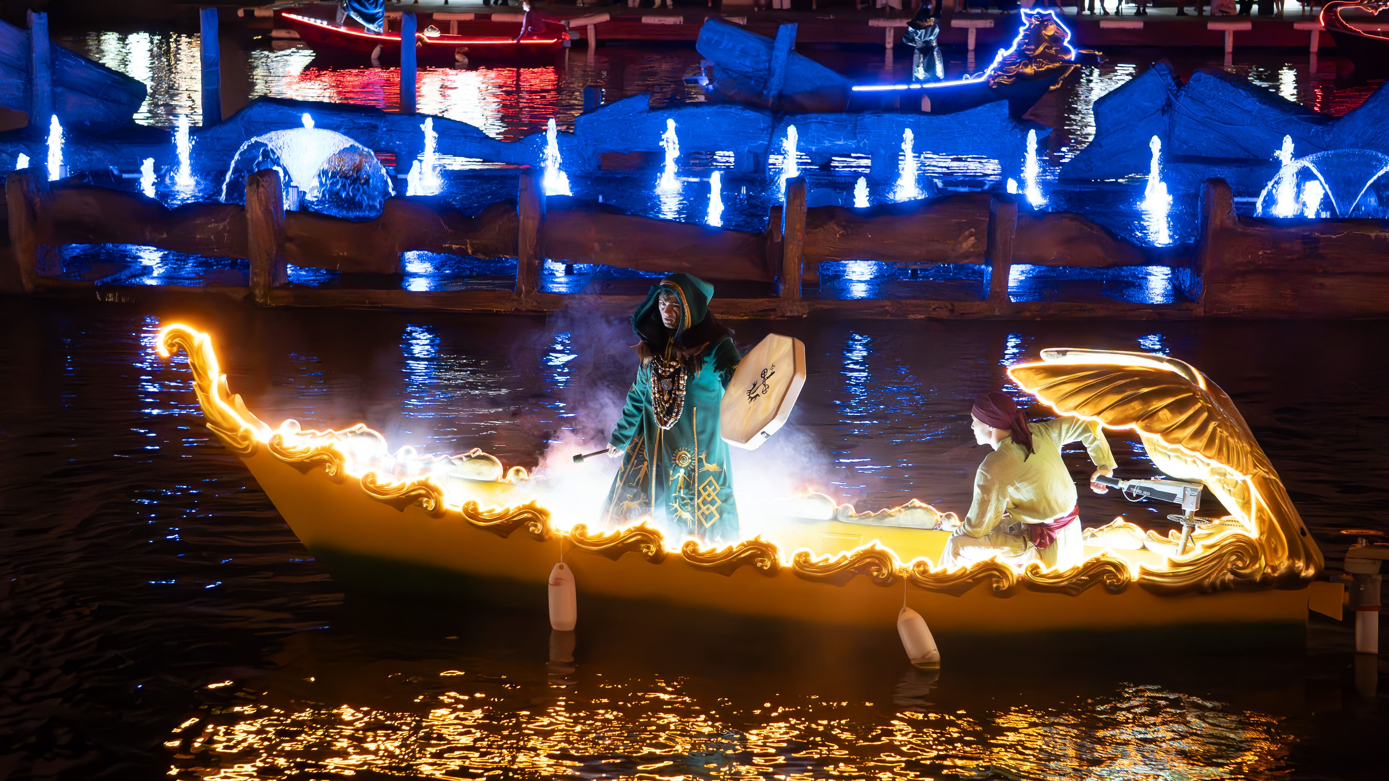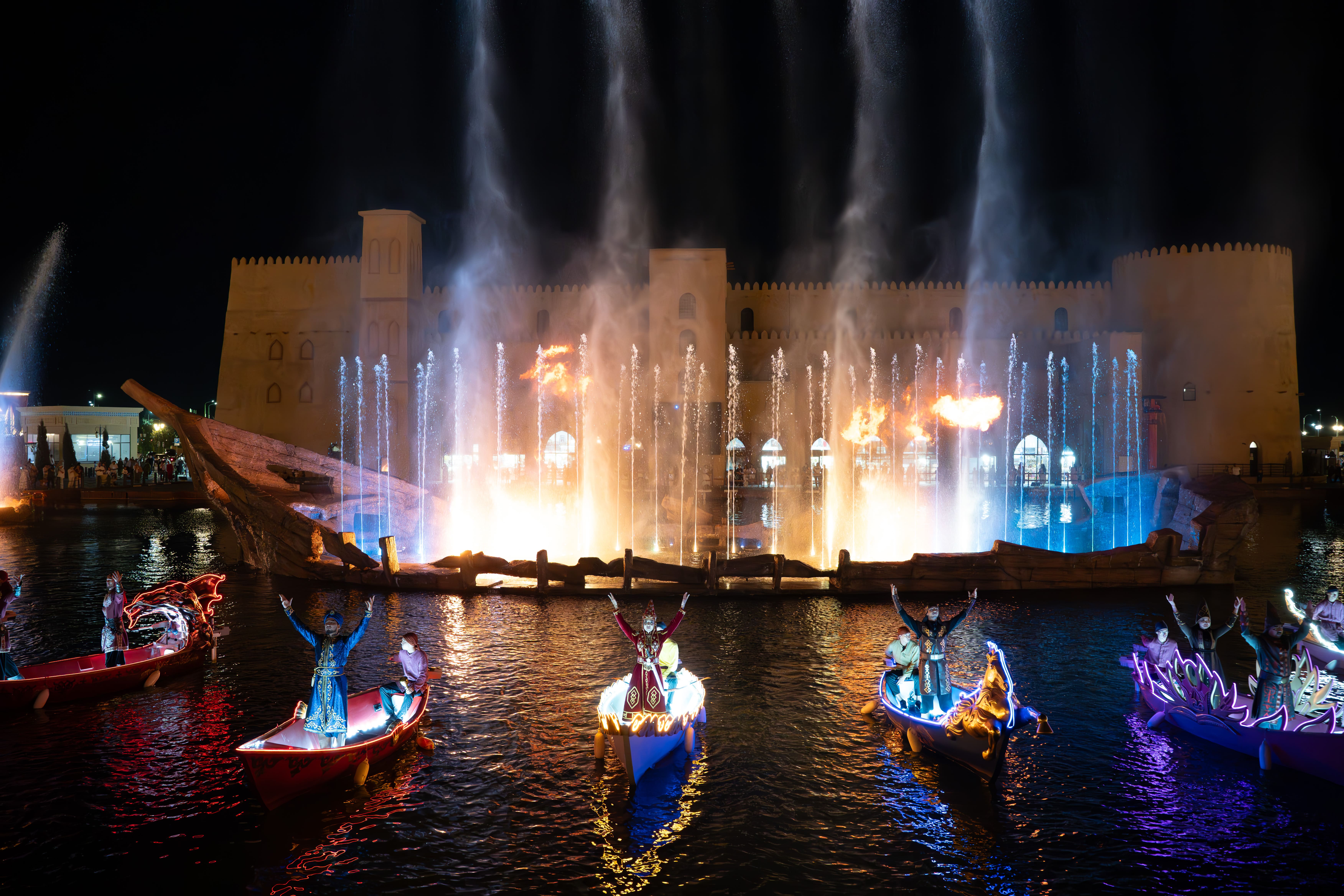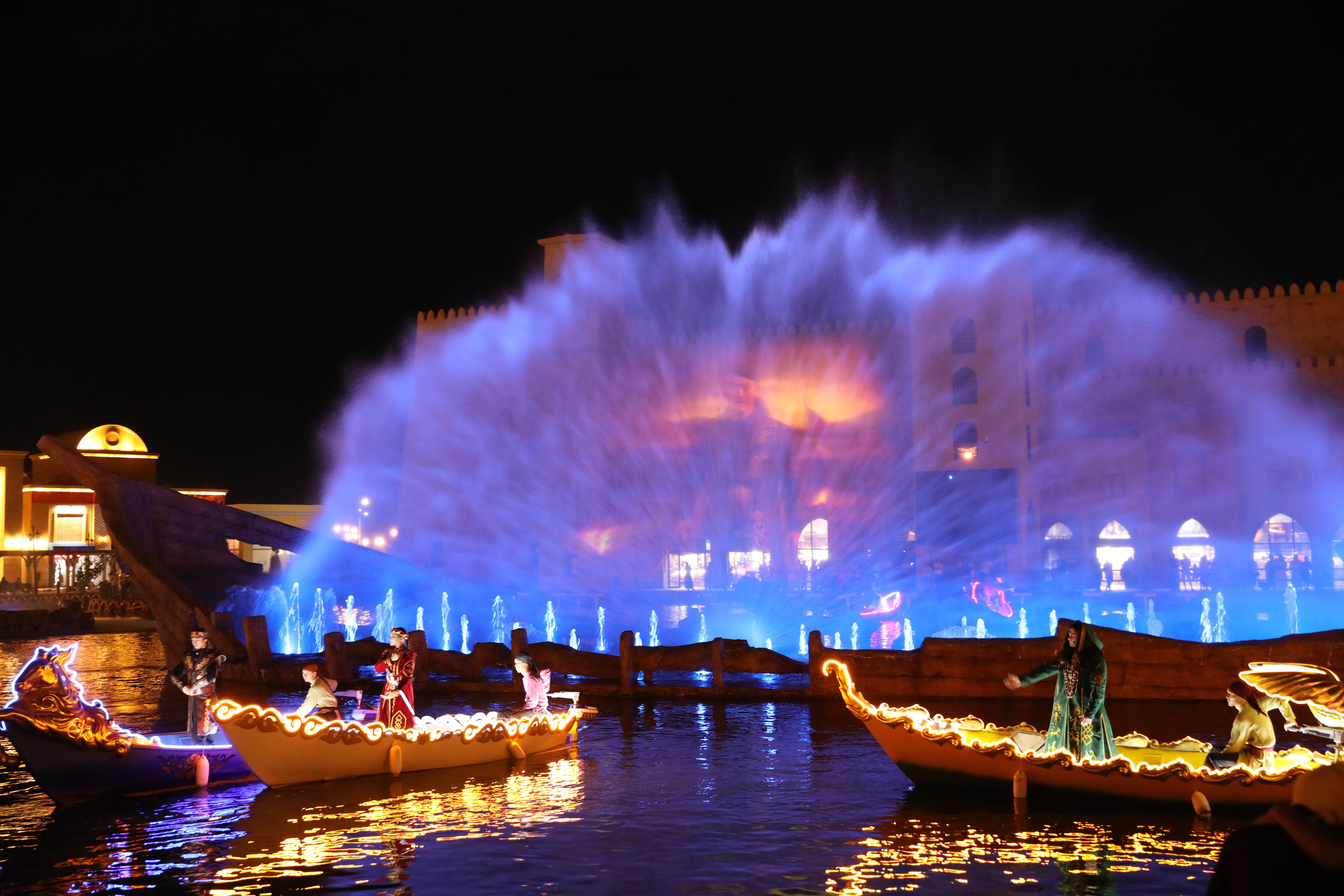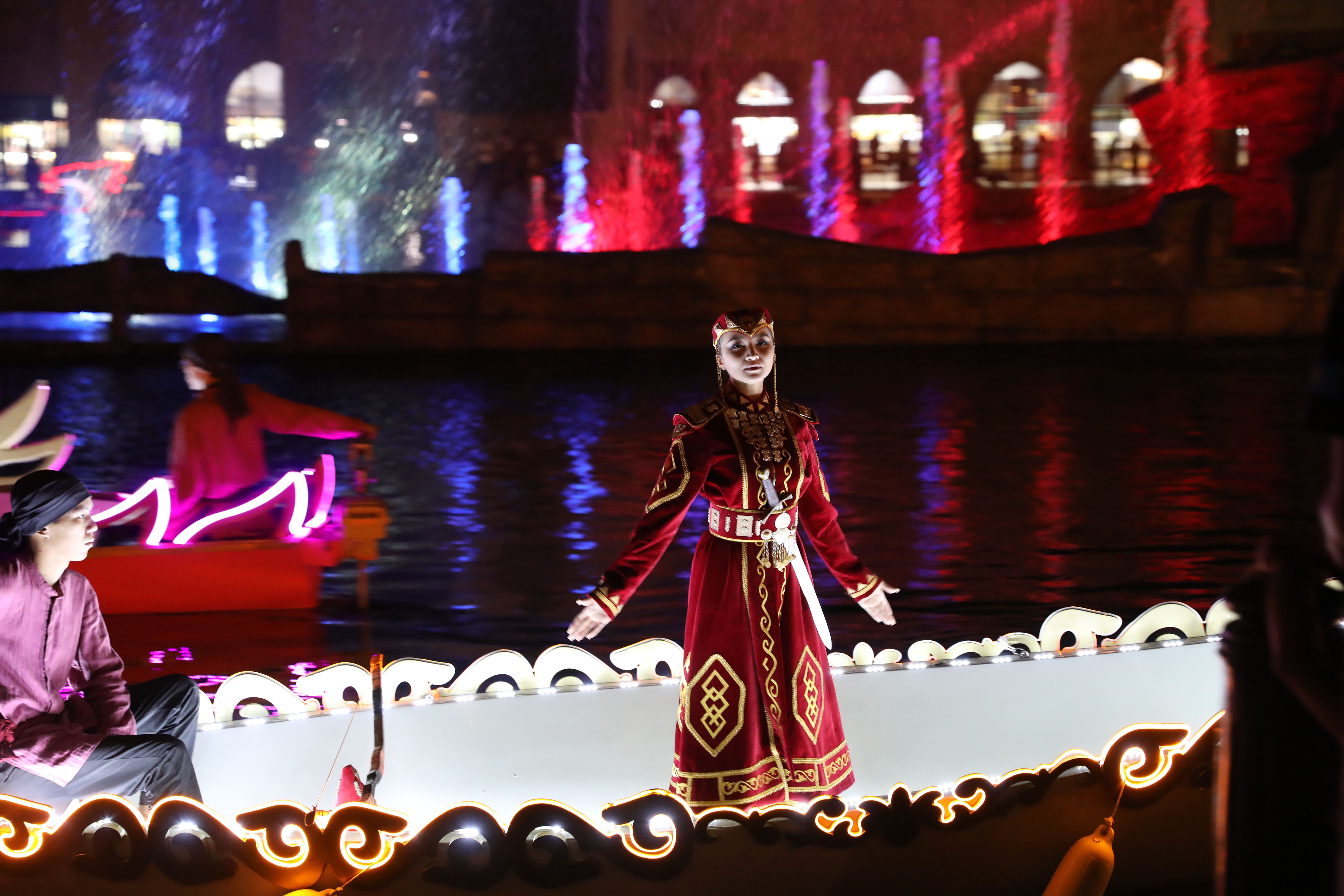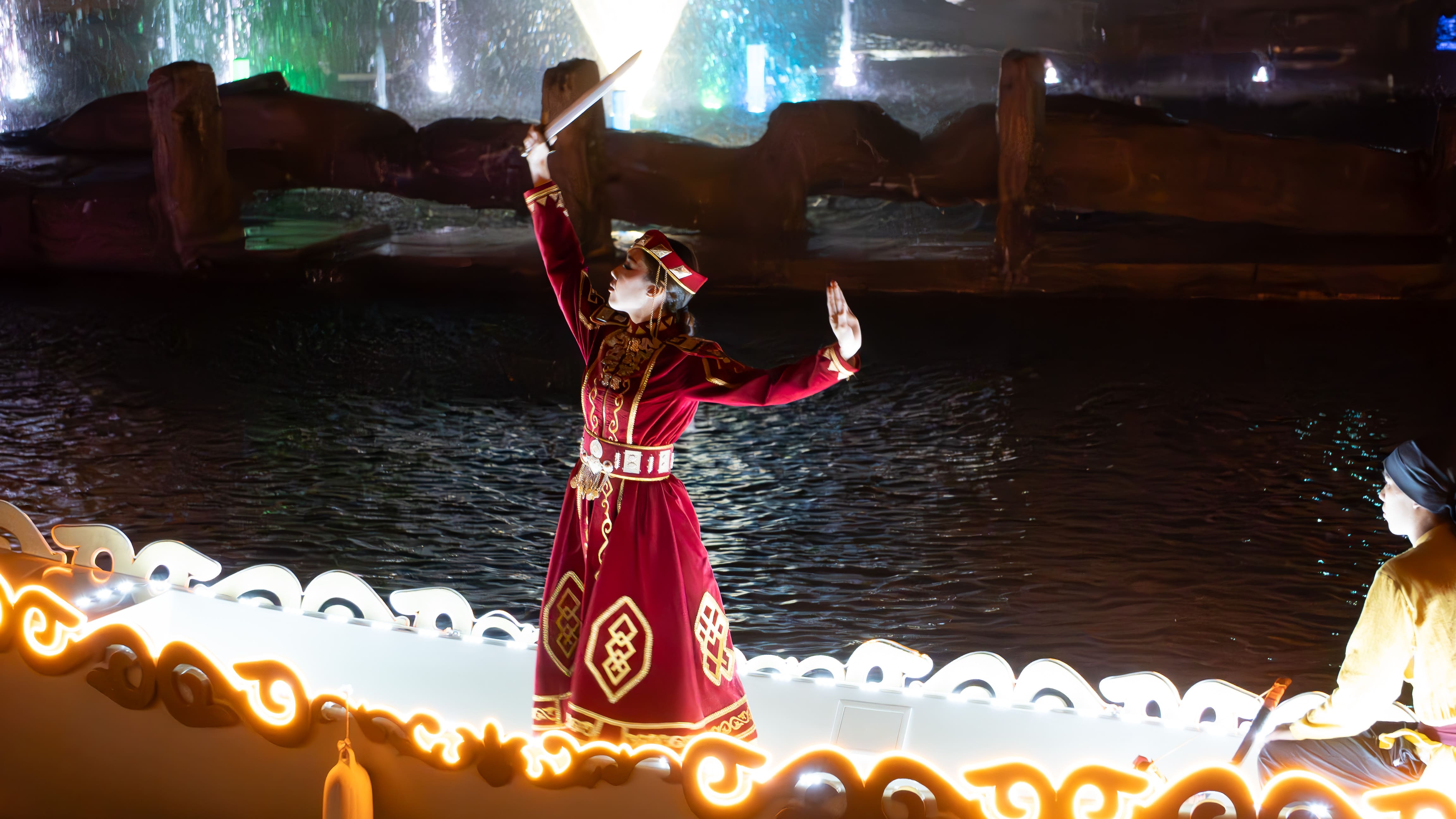 Все персонажи выходят на поклон. Фонтан озаряется проекцией флага Казахстана.