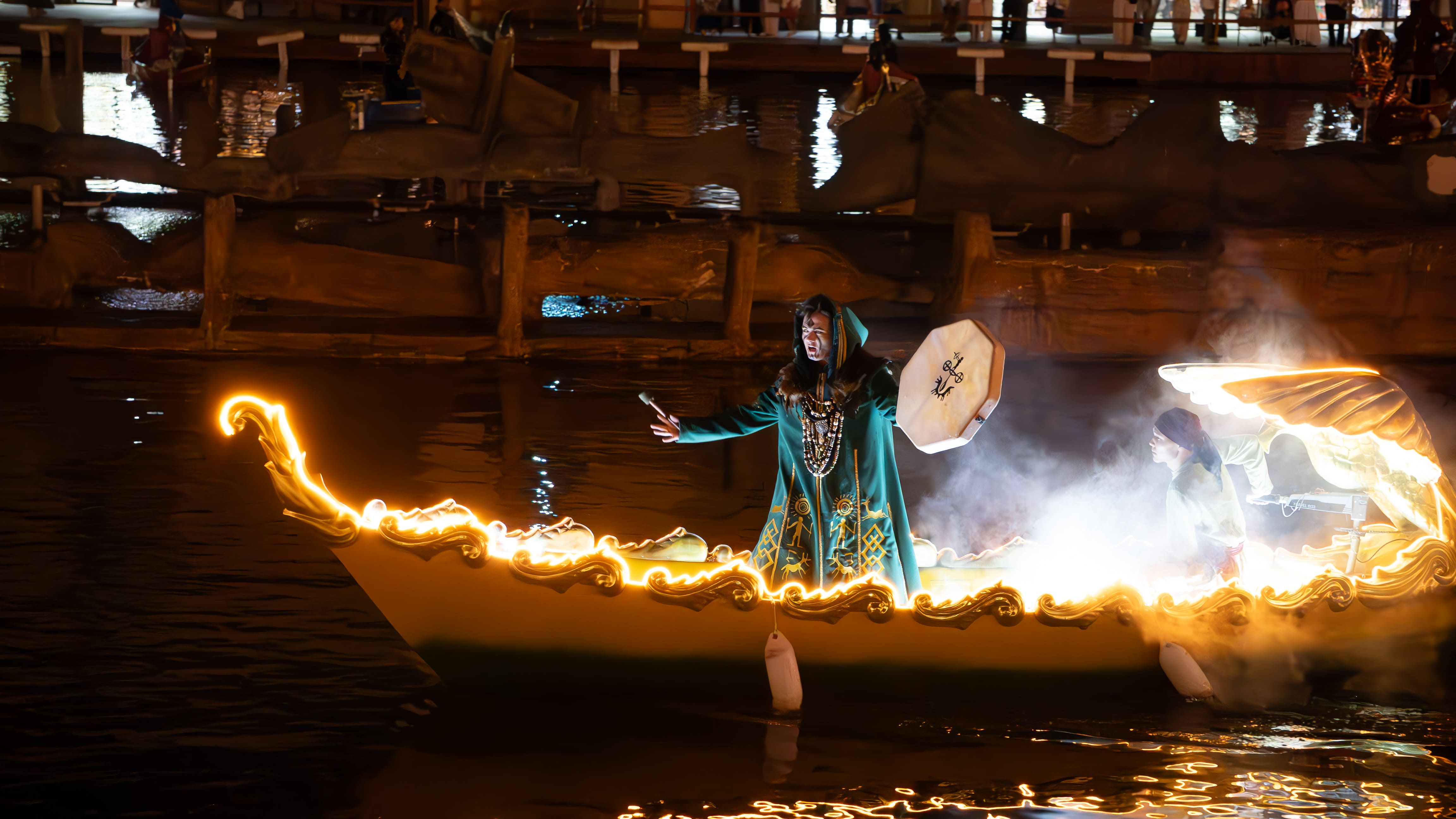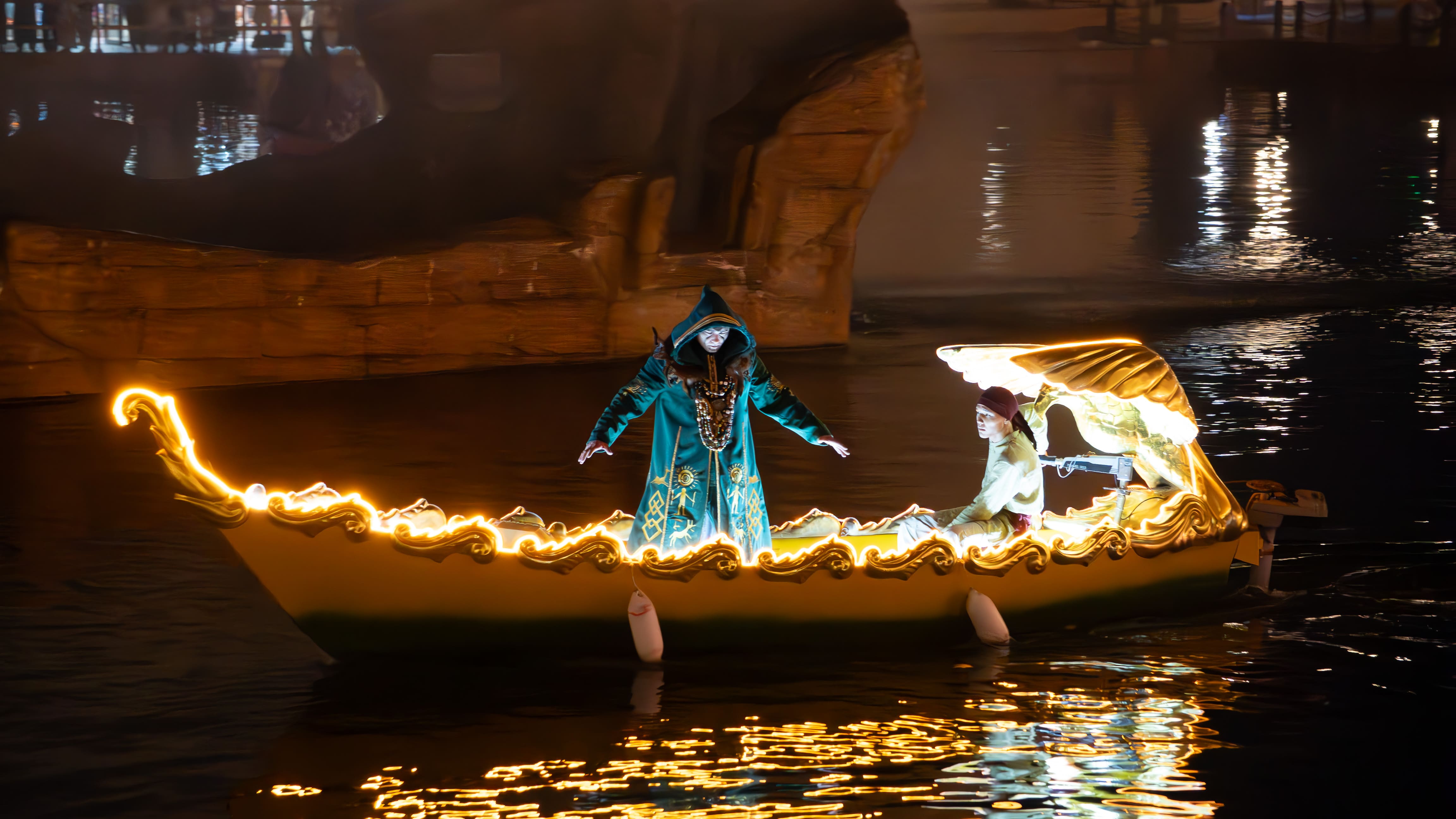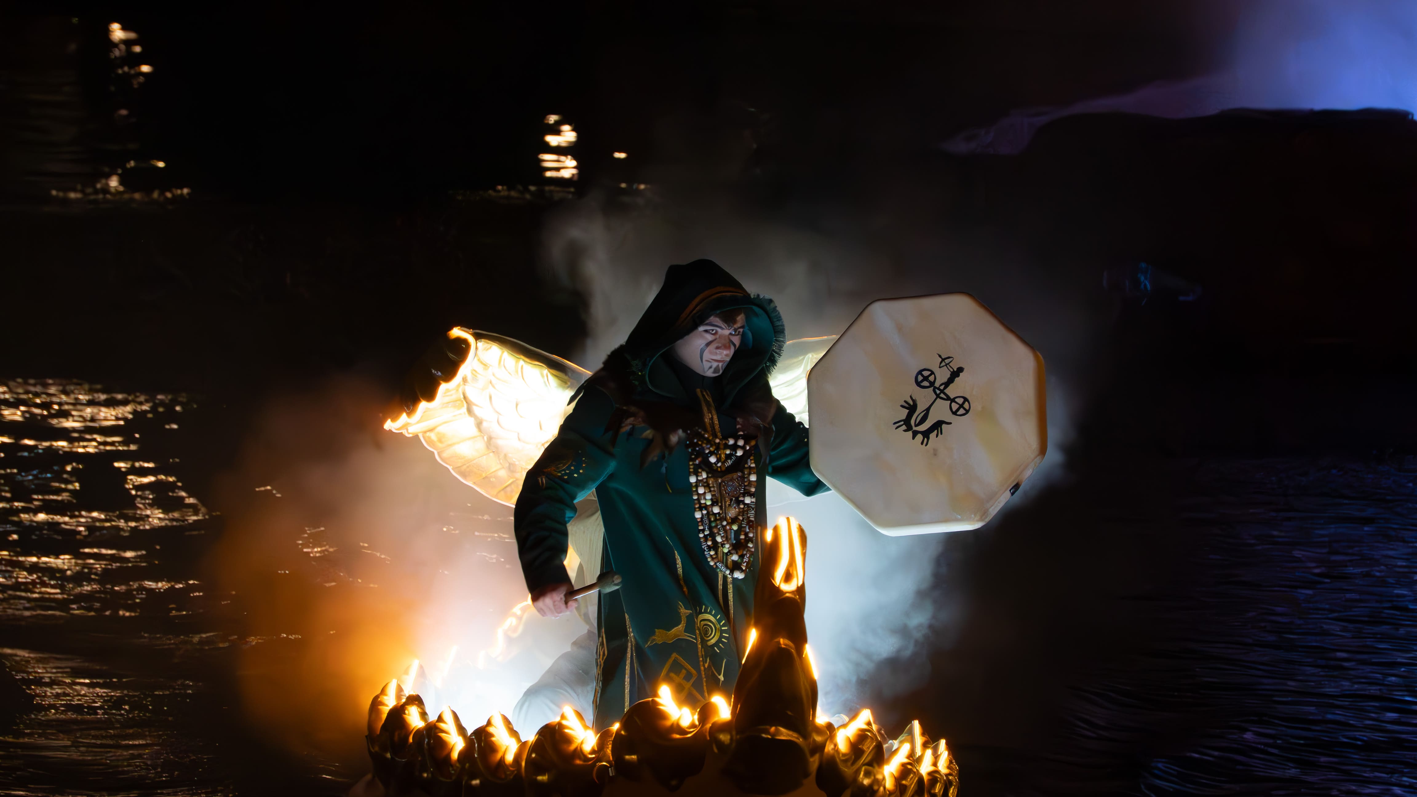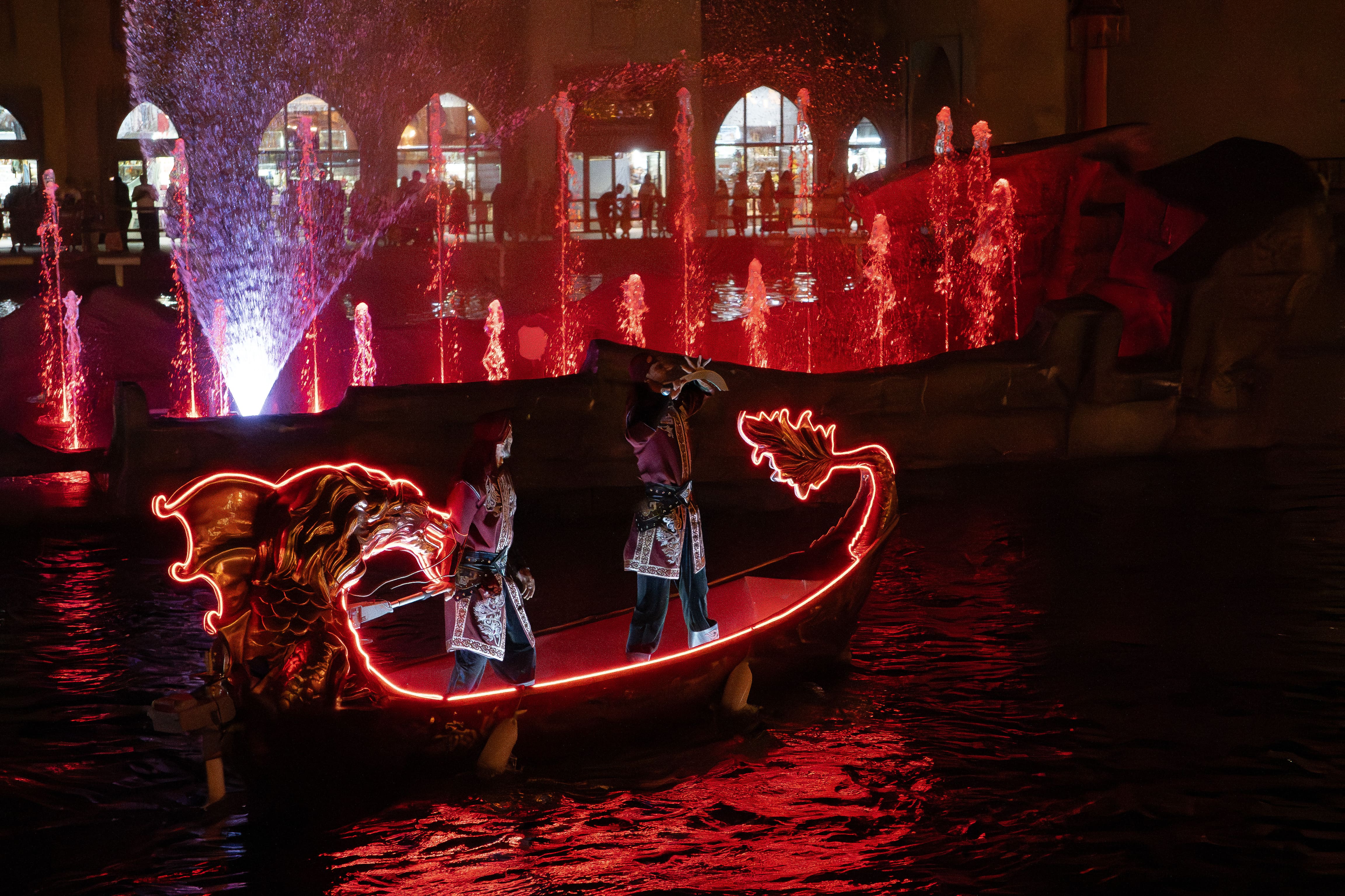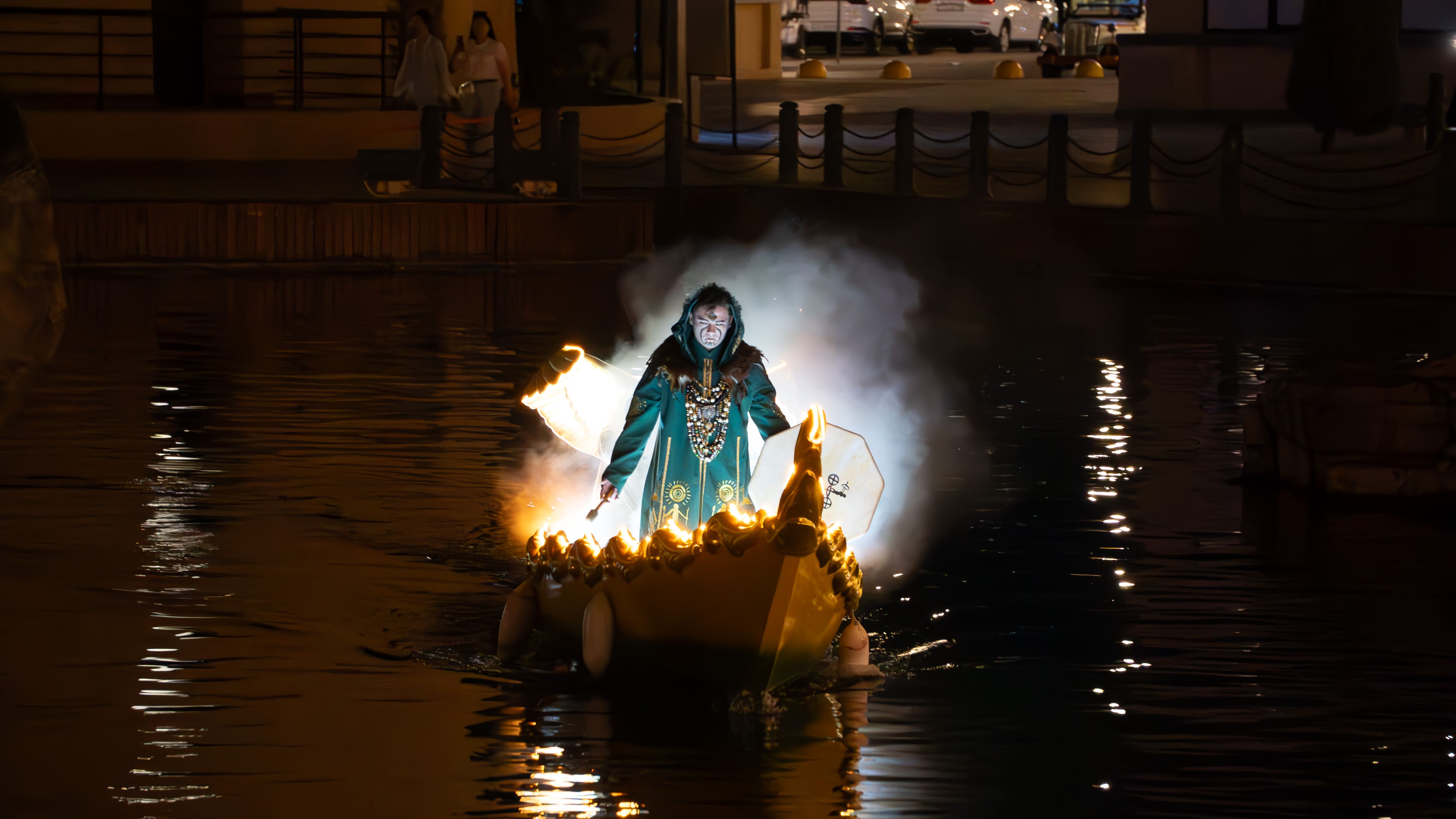 Все персонажи выходят на поклон. Фонтан озаряется проекцией флага Казахстана.